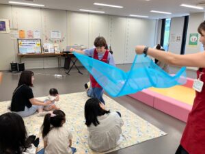 風鈴の音を聴いてリラックスした後、音楽に合わせて思い思いにスカーフ遊びを楽しみましたよ~♪