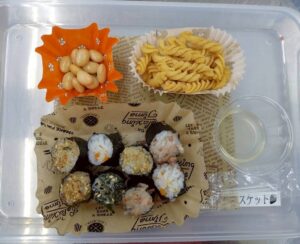 2月の行事食にもぴったりな「巻き巻きおむすび」「マカロニきな粉」「ゆで大豆」✨